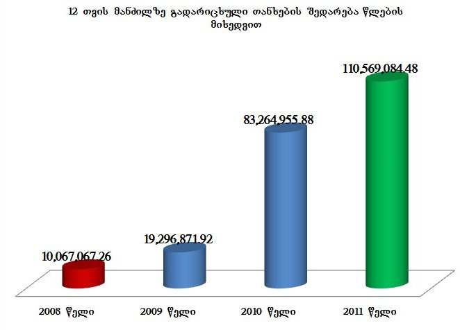 12 თვის მანძილზე სახელმწიფო ბიუჯეტში გადარიცხული თანხების შედარება წლების მიხედვით (2008-2011 წწ.)
