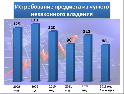Истребование предмета из чужого незаконного владения подразумевает истребование (выселение) недвижимого имущества из чужого владения и/или пользования и/или передачу недвижимого имущества во владение и пользование кредитора. В отчетный период с 2008 года по август 2013 года, Национальное бюро исполнения осуществило истребование 676 недвижимостей из незаконного владения. Статистические данные по годам выглядят следующим образом: