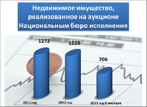 Кроме истребования недвижимого предмета из незаконного владения, Национальное бюро исполнения производит реализацию недвижимых предметов на аукционе. С 2010 года процесс реализации на аукционе производится электронным образом. С 2011 года по август 2013 года Национальное бюро исполнения в целом осуществило реализацию 3206 недвижимых предметов. Также считаем необходимым разъяснить, что данный процесс предусматривает реализацию не только жилья, но и всех видов недвижимости. Статистические данные по годам выглядят следующим образом: