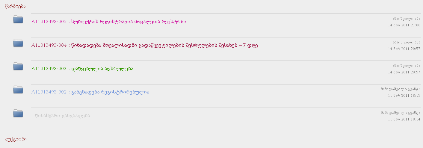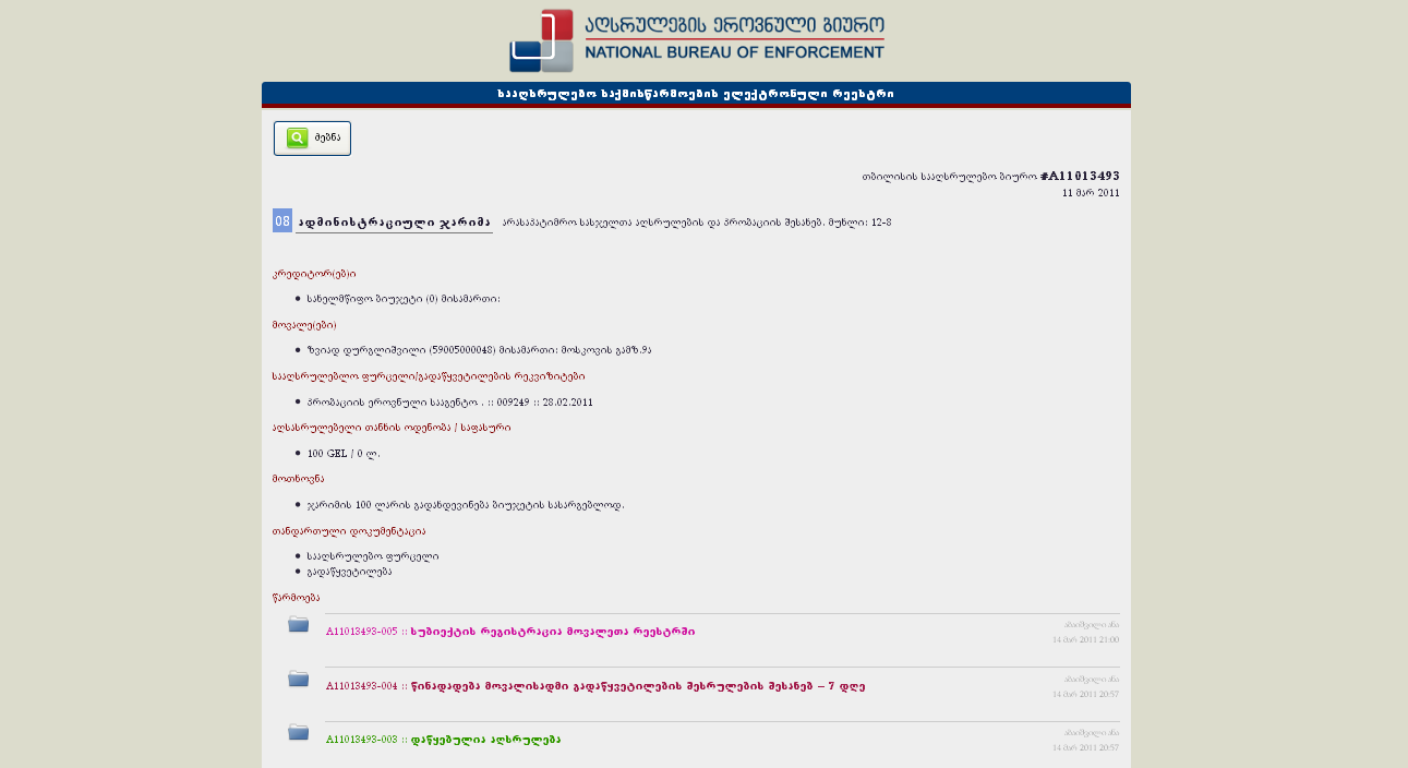 მონაცემები გამოტანილია ვებ-გვერდზე, რომლის საშუალებითაც აღსრულებაში მონაწილე მხარეებს შეუძლიათ მოიძიონ და გადაამოწმონ ინფორმაცია სააღსრულებო საქმესთან დაკავშირებით, გაეცნონ საქმეში არსებულ მასალებს (გარდა კომერციული და საბანკო საიდუმლოების შემცველი და სხვა კომფედენციალური დოკუმენტებისა) სახლიდან და ოფისიდან გაუსვლელად, თვალი მიადევნონ სააღსრულებო წარმოების მიმდინარეობის პროცესს.
